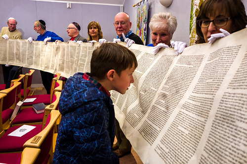 Hebrew religious handwritten Torah parchment scroll.